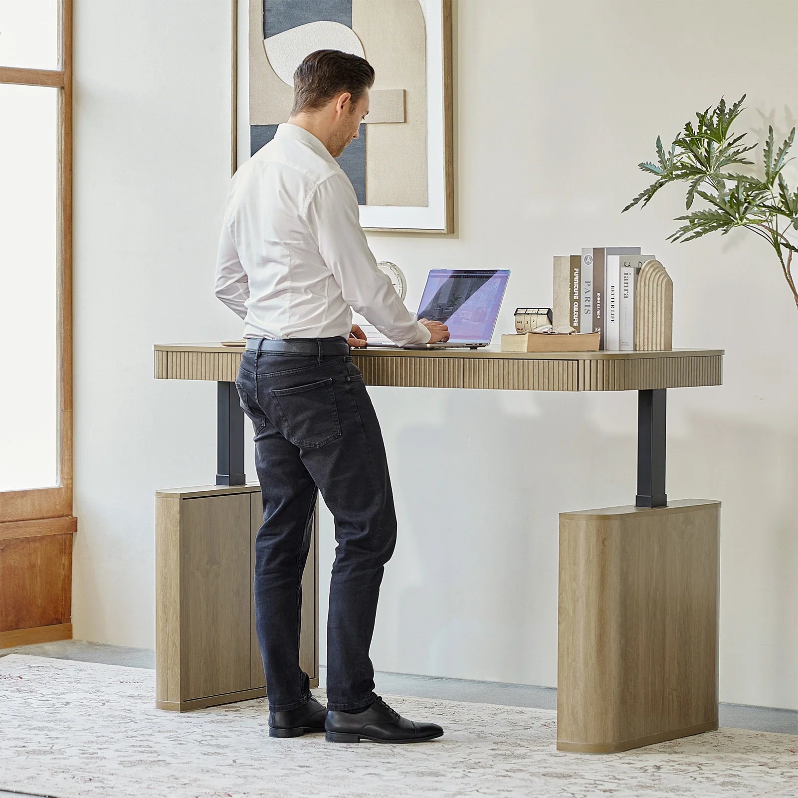 Aggiorna il tuo spazio di lavoro con questa scrivania elettrica regolabile in altezza in stile americano, progettata per funzionalità ed eleganza. Il meccanismo elettrico di sollevamento della scrivania regolabile in altezza consente regolazioni fluide, permettendoti di passare senza sforzo dalla posizione seduta a quella in piedi per una routine di lavoro più sana. Con un elegante dettaglio a listelli, questa scrivania regolabile aggiunge un tocco sofisticato all'arredamento dell'ufficio. Le opzioni di stoccaggio sono abbondanti, con una mensola interna su entrambi i lati per riporre oggetti nascosti, completa di ante a battente con apertura a pressione per un facile accesso. Sotto il piano del tavolo, tre ampi cassetti offrono guide morbide e autoinciudibili, garantendo un utilizzo silenzioso e fluido. Mantieni il tuo spazio di lavoro organizzato con la gestione dei cavi integrata, progettata per nascondere in modo ordinato i cavi e mantenere una scrivania pulita e sistemata. Questa scrivania elettrica regolabile fonde estetica elegante con funzionalità moderna, rendendola la scelta perfetta per un ufficio domestico o un ambiente di lavoro contemporaneo.